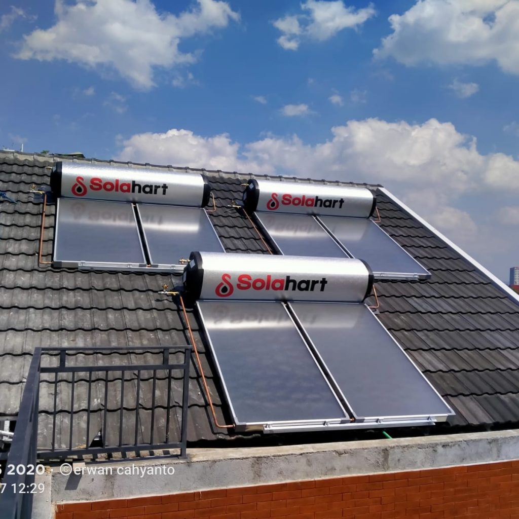 - Air Panas Tersedia Sepanjang Tahun, 24 Jam Setiap HariWalaupun kondisi matahari tidak bersinar dengan optimum, air panas tersedia setiap saat dengan adanya backup electric Booster Heater yang bekerja secaraotomatis ataupun manual dan bekerja secara efisien.